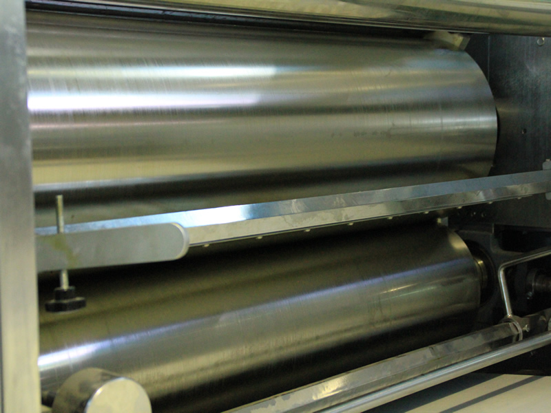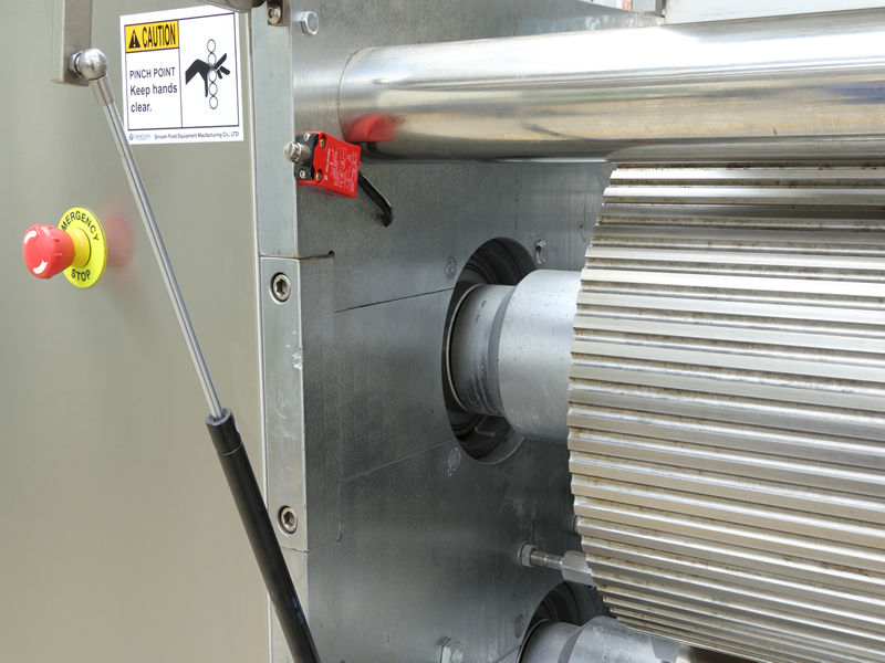 本設備將打好的面團通過軋輥軋成面皮,適用于韌性面團。輥邊與軋輥用外六角鏈接,滑塊式調節面皮的厚度。鏈條節距采用雙排鏈,鏈條張緊采用彈簧拉緊。喂料機配備2個驅動,喂料輥輥動力變頻調速。